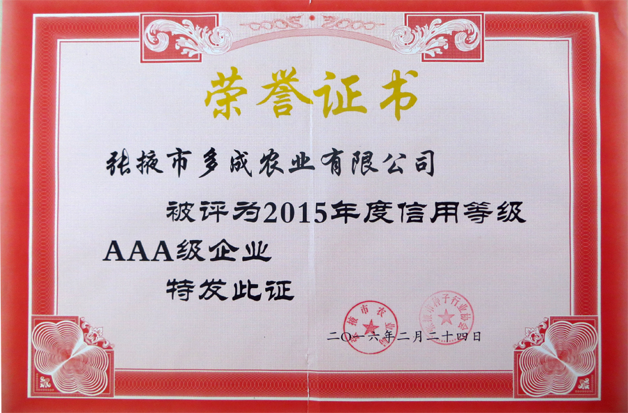 熱烈祝賀張掖市多成農(nóng)業(yè)榮獲2015年度信用等級AAA企業(yè)稱號 (2016-02-26)